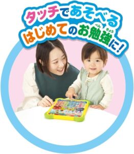タッチで簡単に遊びながら「あいうえお」のお勉強ができ、うた入りのメロディも楽しめるキッズタブレットです。「あいうえお」のお勉強とうた入りのメロディ以外に、仲間たちのおしゃべりや効果音で遊べます。うた入りのメロディは全5曲を収録しています。お子様に身近な動物の鳴き声と乗り物の音を収録しています。文字の問題と音の問題が合わせて約60問出題されます。