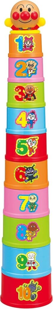 10個のカップを重ねる、並べる、物を入れるなど豊富な遊びができます。カップの側面に数字が入っているので、積み重ねながら1~10までの数字が学べます。カップの底面にも数字と仲間たちの彫刻が入っています。アンパンマンの大きな人形が付いています。アンパンマンと仲間たちが10人描かれています。脳科学者の第一人者 久保田競先生推薦の天才脳シリーズ商品です。