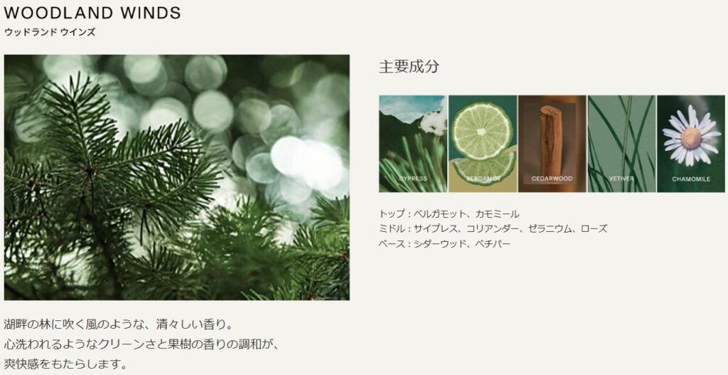 WOODLAND WINDS(ウッドランドウインズ) 湖畔の林に吹く風のような、清々しい香り。シトラスとウッディが調和した爽快感のある香りです。
