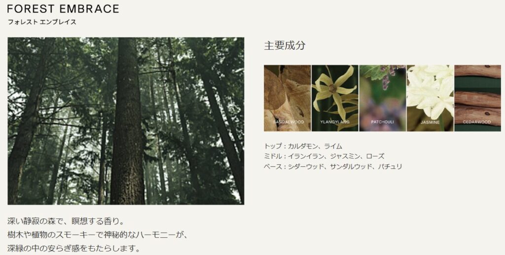 FOREST EMBRACE(フォレストエンブレイス) 深い静寂の森で瞑想するような、落ち着いた香り。スモーキーで神秘的なハーモニーが特徴です。