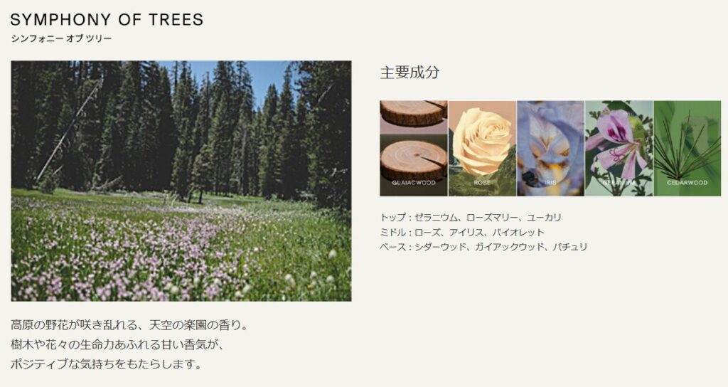 SYMPHONY OF TREES(シンフォニーオブツリー) 高原の野花が咲き乱れる天空の楽園をイメージした、フローラルで甘い香りです。