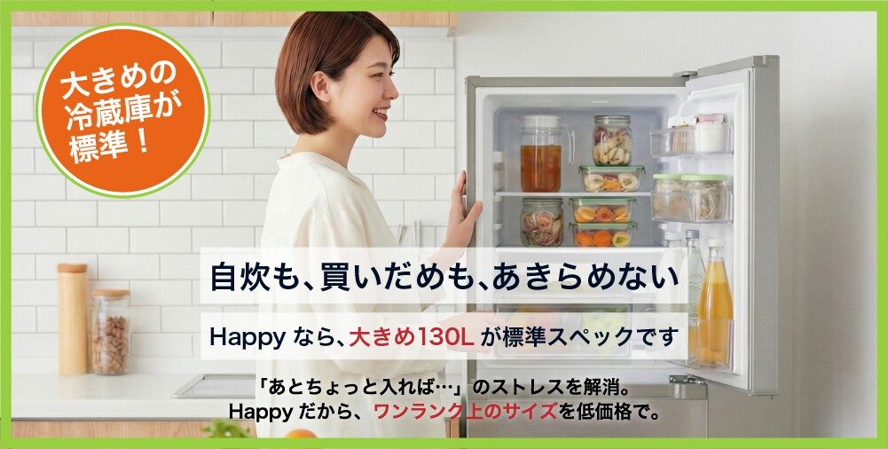 冷蔵庫、洗濯機、電子レンジといった「三種の神器」をまとめたセットプランが非常に充実しています。一括払いでトータルコストを抑えるプランや、月々定額のサブスクリプション形式など、予算に合わせて柔軟に選択可能です。また、特筆すべきは冷蔵庫のサイズです。他社サービスでは100L以下の小型サイズが標準となることが多い中、Happyでは少し大きめのサイズを標準として提供しているため、自炊をする方でも余裕を持って利用できます。