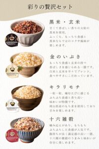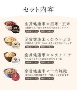 多彩なラインナップ 黒米・玄米、十六雑穀、金のいぶき(宮城県産玄米)、キラリモチ(岡山県産もち麦)など、豊富な種類が用意されており、毎日飽きずに続けられる工夫がされています。