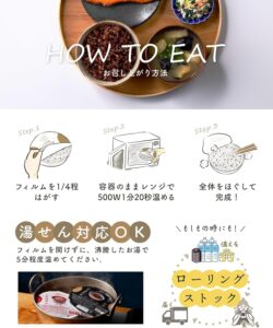 レンジで簡単調理 忙しい日でも、パックのまま電子レンジで1分20秒(500Wの場合)温めるだけで、本格的な健康ごはんがすぐに完成します。炊飯の手間や時間をかけずに、炊きたての美味しさと栄養をそのまま楽しめます。