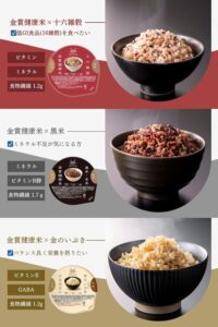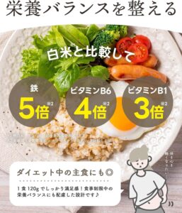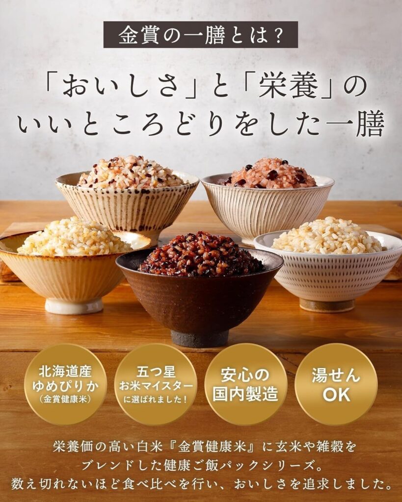 その理由は、近畿大学農学部と共同開発した独自の「金賞健康米」を全シリーズに使用している点にあります。この金賞健康米は、北海道産ゆめぴりかをベースに、独自の製法によってビタミン残存率を高めているのが大きな特徴です。白米のような食べやすさを保ちながら、健康に不可欠な栄養素をしっかり摂取できる設計になっています。