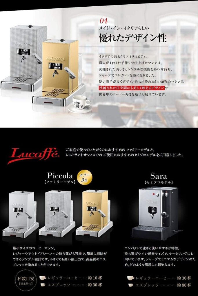 ルカフェのコーヒーマシンには、様々な種類がありますが、代表的なモデルとして「Piccola」シリーズが挙げられます。