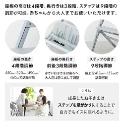 長期使用が可能 生後6ヶ月頃から大人まで使える「ロングユース」設計です。座面は4段階、足置きは9段階で細かく高さ調節ができ、お子さんの成長に合わせて最適な姿勢を保つことができます。