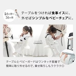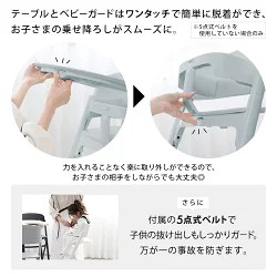 使い勝手の良さ テーブルとベビーガードはワンタッチで簡単に取り外しができ、お子さんの乗せ降ろしがスムーズです。また、本体は樹脂製で汚れが染み込まず、お手入れがしやすいのが利点です。