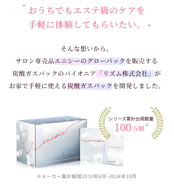 炭酸ガスパック【enisieグローパック】で有名な美容専売メーカーのリズム株式会社が開発した新しい炭酸ガスパックで、 開けて塗るだけでできる手軽さとお風呂場での使用も可能なパックというのも使い勝手がいいです。