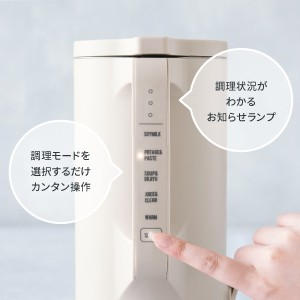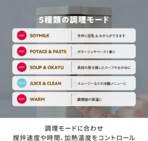 5つの調理モード 「豆乳・おから」、「ポタージュ・ペースト」、「食べるスープ・おかゆ」、「ジュース・クリーン」、「保温」の5つのモードがあり、なめらかなポタージュから具材の形が残ったスープ、おかゆ、冷たいスムージー、手作り豆乳まで幅広く作れます。